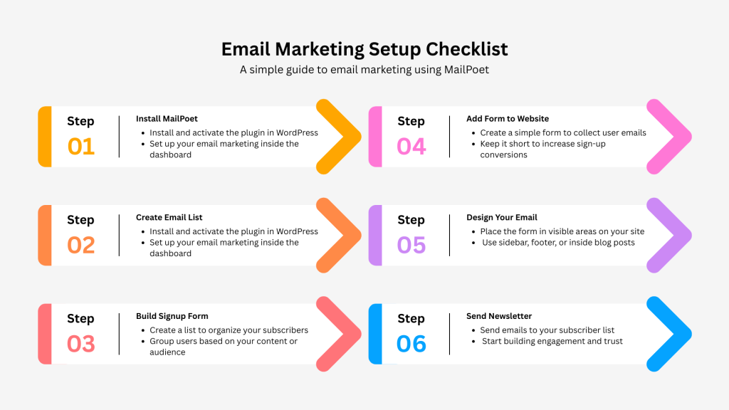 This visual checklist highlights the key steps needed to set up email marketing in WordPress using MailPoet.